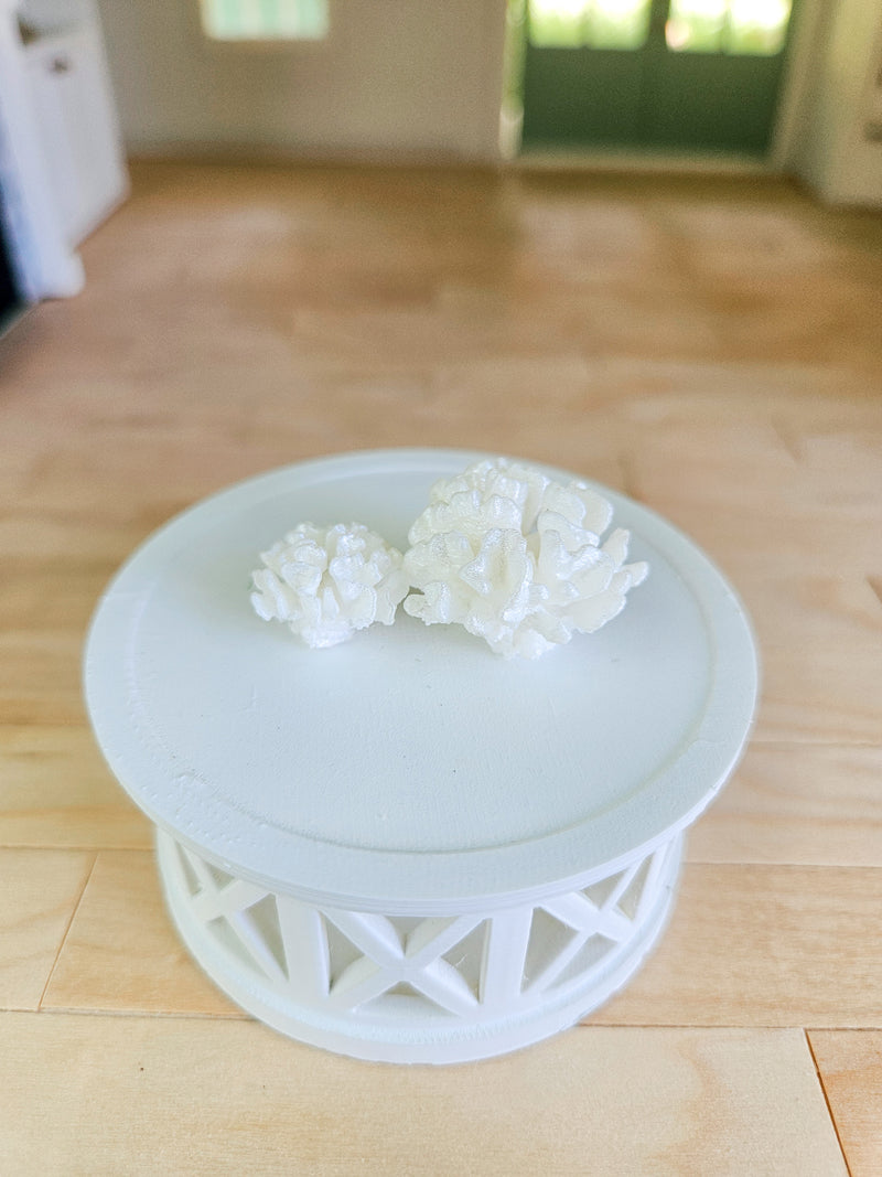 Dollhouse miniature coral. The large coral is approximately 1" wide and 0.625" tall, while the small coral is 0.75" wide and 0.5" tall. These adorable coral decorations would look perfect in any dollhouse beach house!