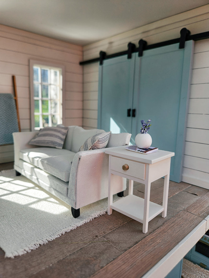 Dollhouse miniature end table with opening drawer. The end table comes unpainted (white PLA, ready to paint) with the knobs unattached for easier painting. This mini end table is approximately 2.5" tall, 2" wide, and 1.5" deep. This end table would look adorable in any dollhouse living room or bedroom, and looks even better with a cute lamp or mini plant on top. This listing is for one end table only.