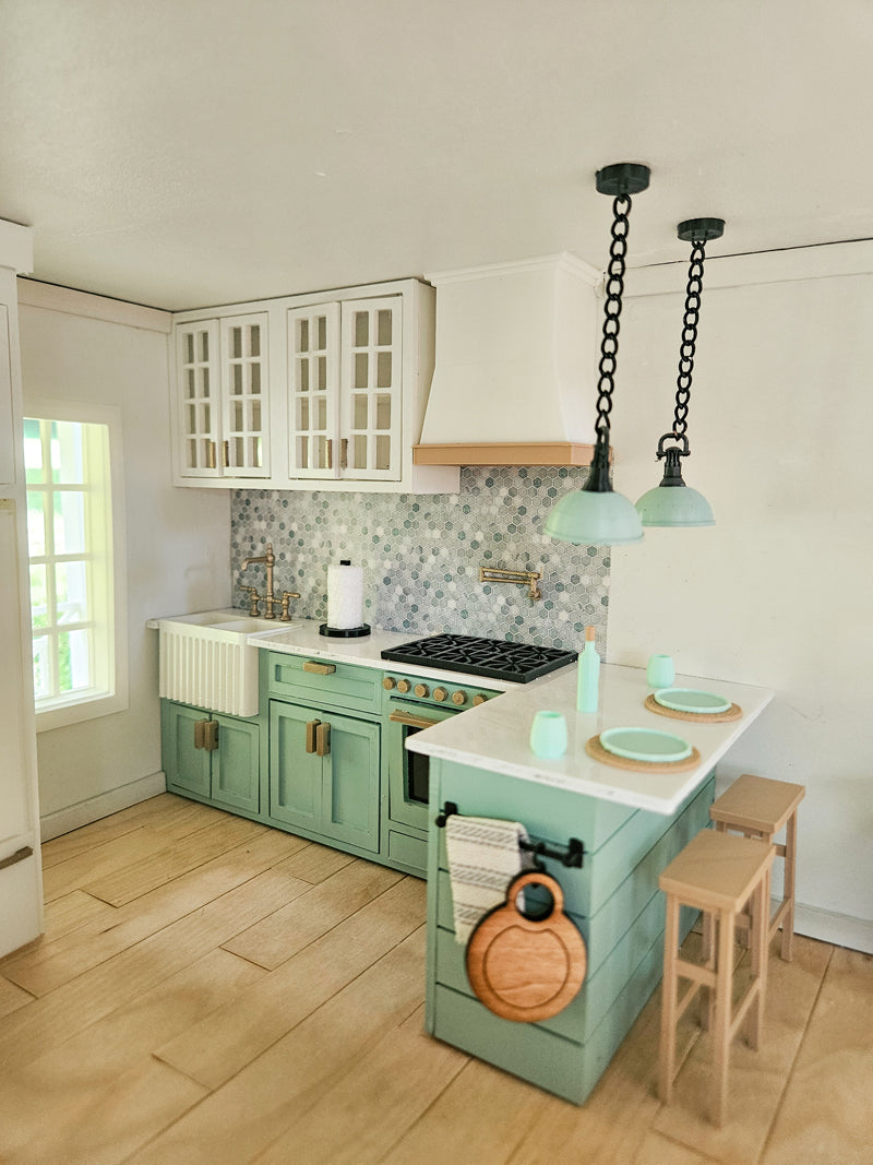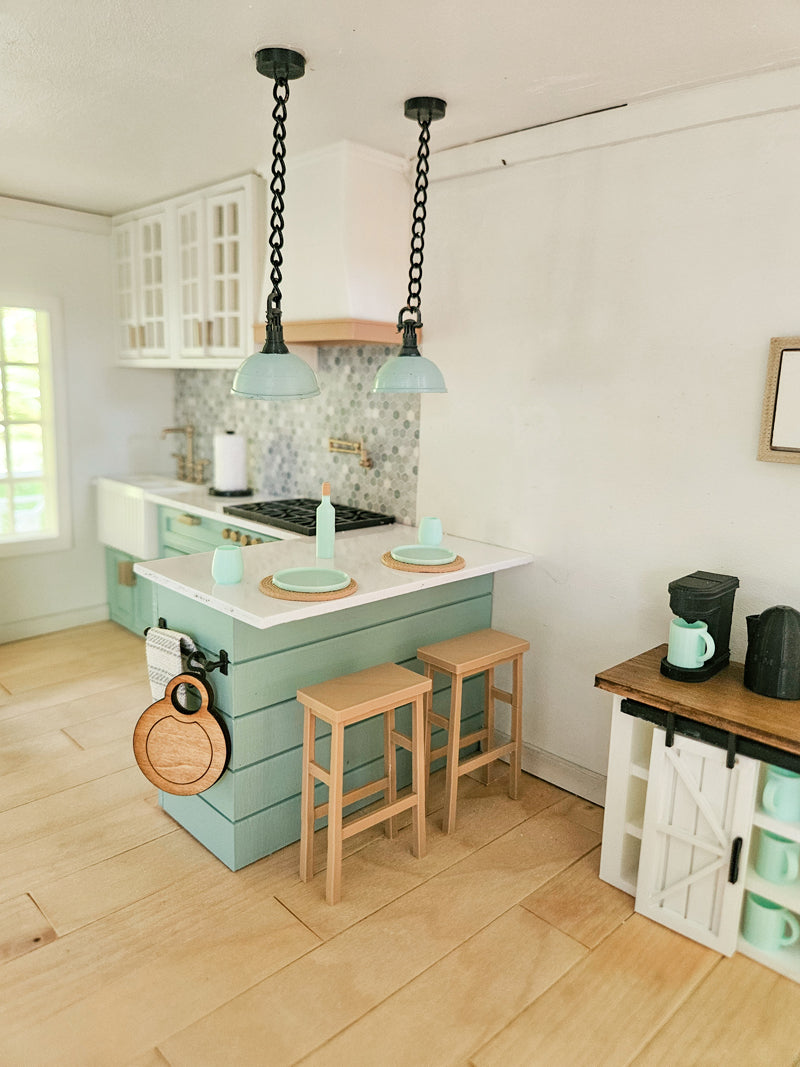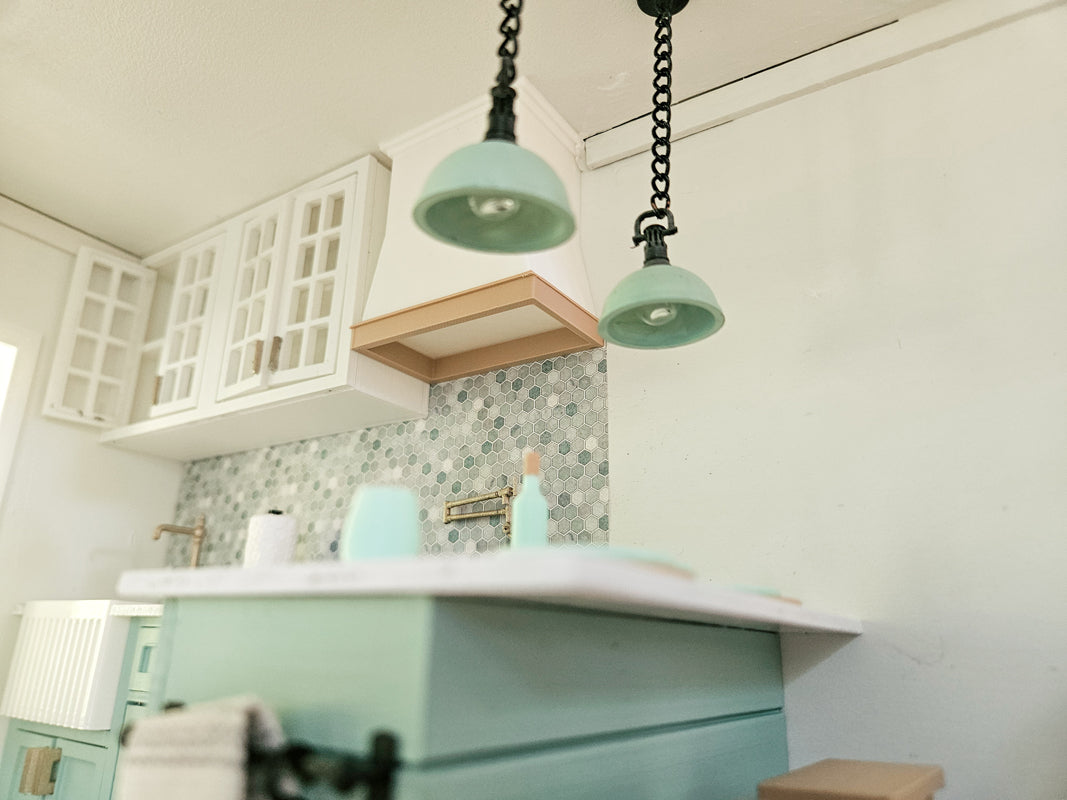 This light comes with a white lamp shade which you can paint any color you would like, and you can choose to get the upper part of the light, the chain, and hardware in either silver or black. These lights would be the perfect addition for your dollhouse kitchen!
