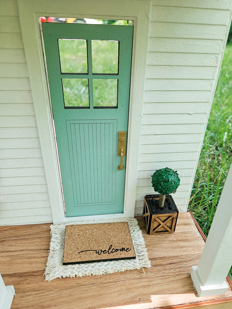 Dollhouse Miniatures Door mat. Welcome your neighborhood dolls into your dollhouse with this textured cork engraved door mat. The cork mat is attached to a piece of woven fabric. This mini door mat measures approximately 3.5” by 2.5”. This listing is for one mat only, other accessories not included.