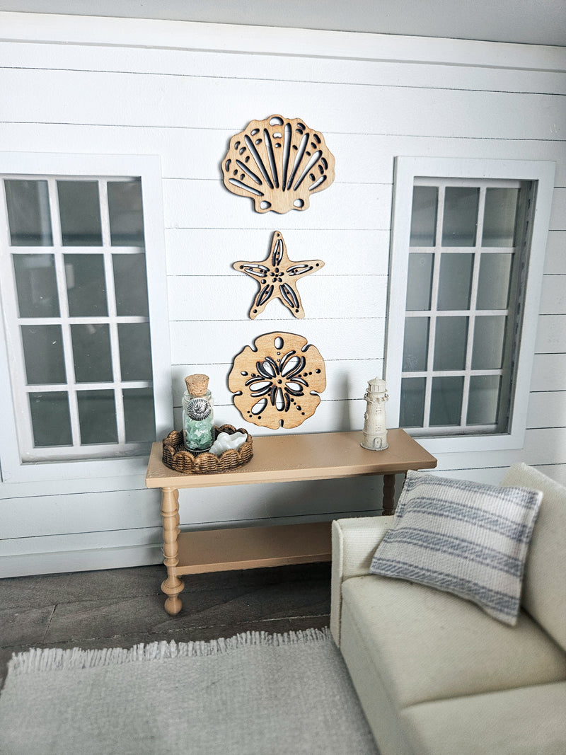 Set of 3 custom dollhouse miniature coastal wall art. These stained wood mini shell wall art pieces would look adorable in any beach-themed dollhouse. Each piece measures 1.5″ tall and 1.25″ wide. This listing is for the 3 shell wall art pieces only.