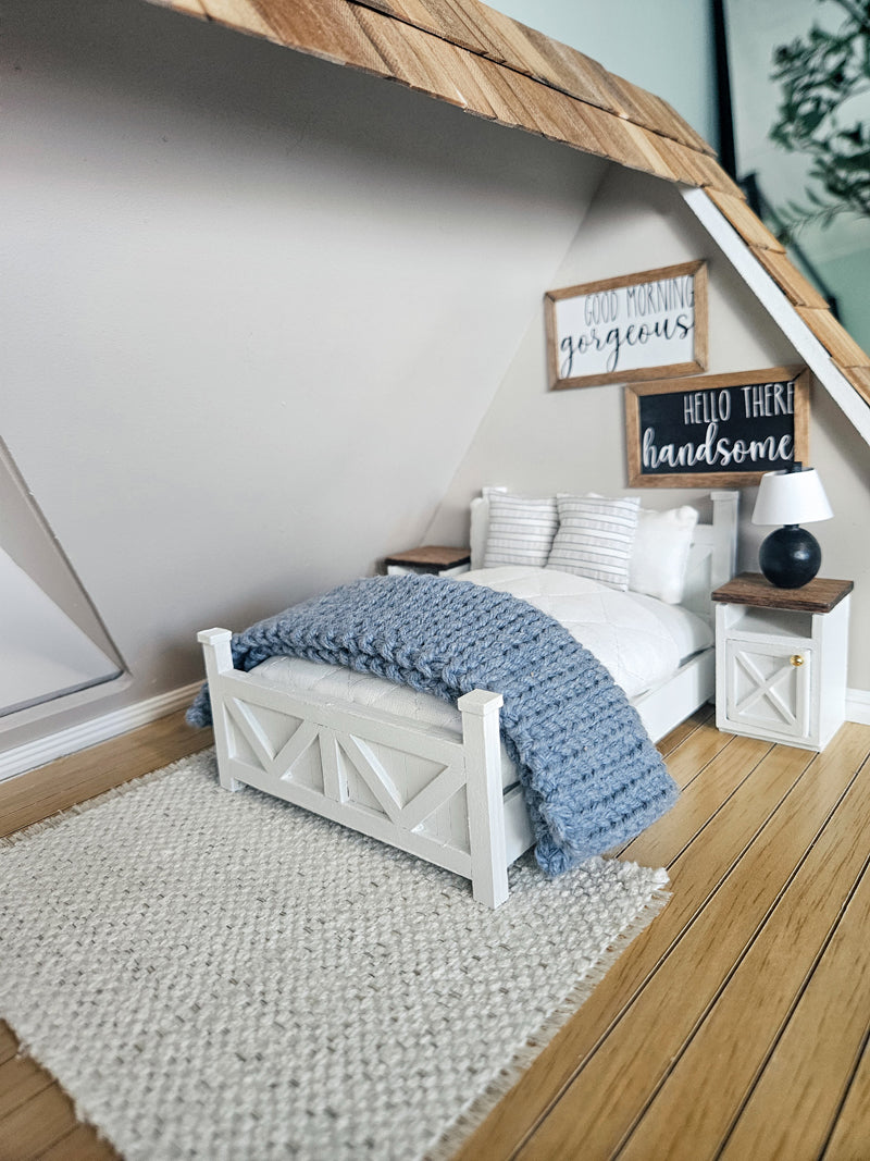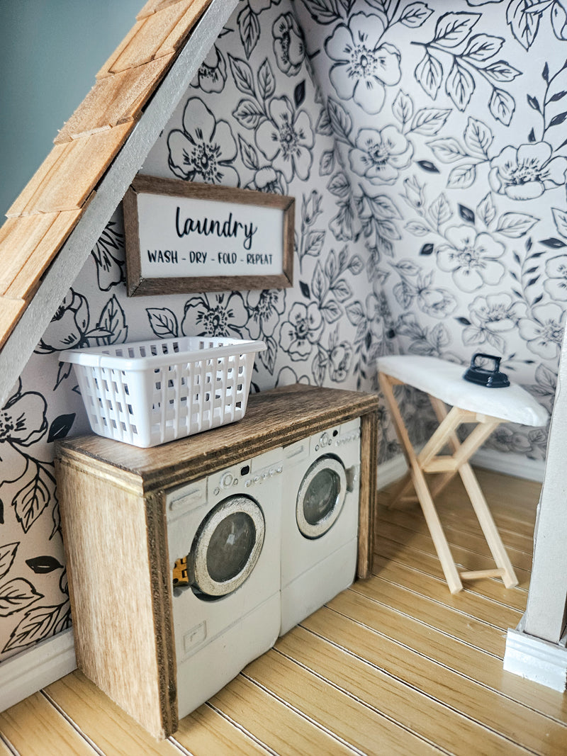 "The Cedar Lane" custom dollhouse features a modern style with miniature farmhouse touches. White exterior with accents of stained wood, as well as a covered porch and custom (non-working) lights on either side of the wooden door. Inside showcases shiplap walls, simple and fun paint colors, and modern wallpapers. Kitchen comes stocked with everything in the photos, including the miniature kitchen island, pots and pans, cookbooks, etc. Travel through the kitchen into the moody mini dining room with its deep black walls and pops of stained wood. Your dolls can cozy up in the living room on the comfy couch with a soft blanket, and read one of the mini house decor books in front of the custom fireplace. The bathroom is the perfect place to unwind, with a gorgeous vanity featuring double sinks, and a bathtub to soak all of your doll's troubles away. The master bedroom features a gorgeous farmhouse bed and nightstands, as well as a dresser with working drawers to store all the small miniatures your doll could need. Then, step into the laundry room with it's fun floral wallpaper, complete with washer, dryer, and ironing board. Every item in this home has been assembled with love and comes with the purchase of the dollhouse. This would make the perfect heirloom gift for you and your family to enjoy for years to come.