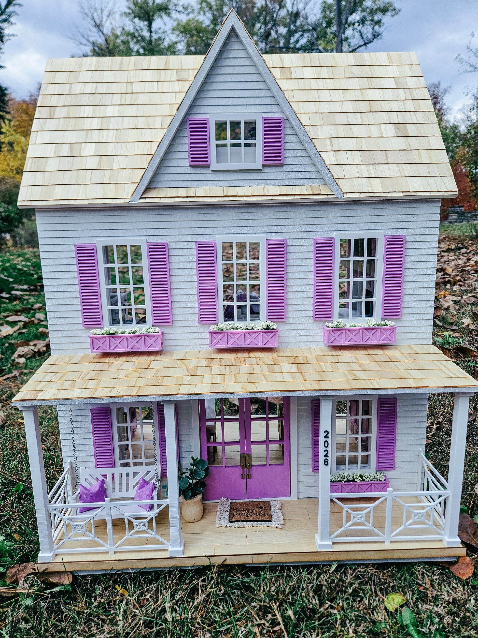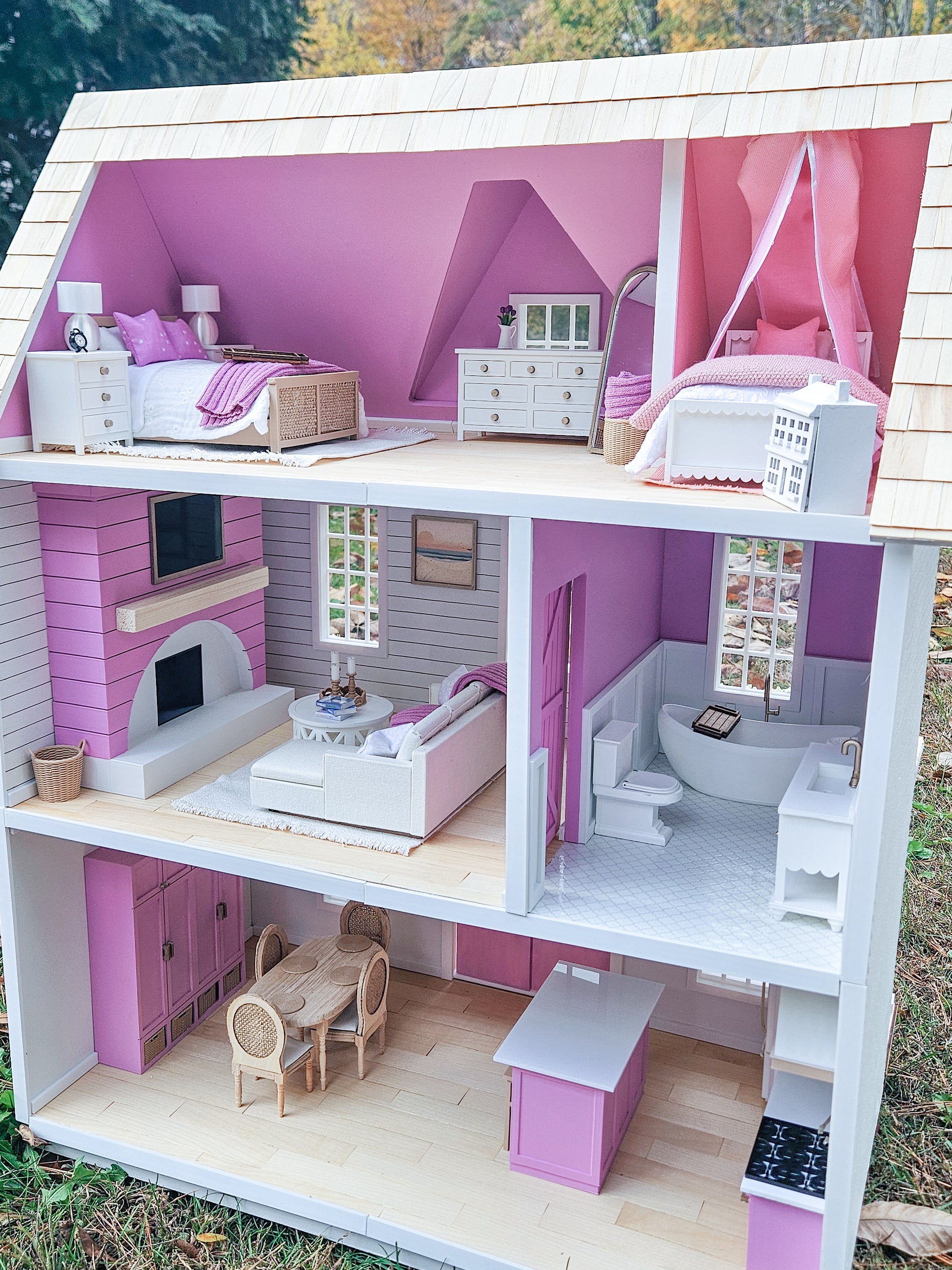 The "Hamptons House" custom dollhouse features a modern style with miniature coastal touches. This modern dollhouse is in 1:12 scale, with a white exterior with accents of the most beautiful purple.