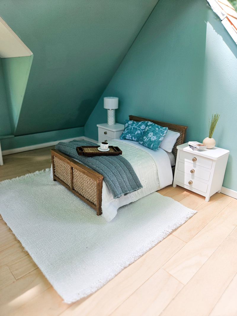 The second story features a spa-like bathroom in the same beautiful coastal blue, with a gorgeous scalloped vanity, and a large bathtub to wash all of your doll's troubles away. The rest of the second level includes a master bedroom with a gorgeous rattan bed and set of white nightstands, as well as a dresser and decor. The dresser and nightstand drawers are all able to open. The master bedroom also has a sliding barn door that leads into the bathroom.