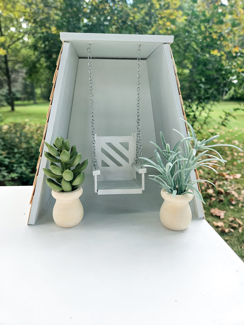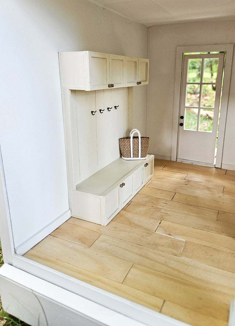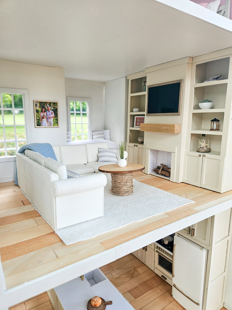 The "Sweet Magnolia" custom dollhouse features a modern style with miniature coastal touches. This modern dollhouse was built for a client based on their house in South Carolina. This modern dollhouse is in 1:12 scale, with a white exterior with accents of black and cedar, as well as a covered porch and custom front door and porch railings.