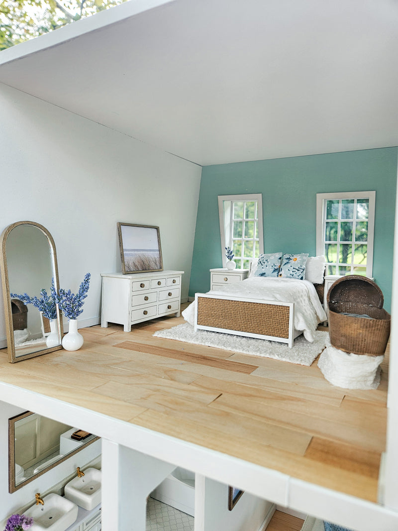 The third story features a master bedroom with a gorgeous rattan bed and white nightstands, as well as a dresser, bassinet, and other decor. Next to the master bedroom is an adorable light pink girl's room, complete with two twin beds, custom name signs, a dresser, and even a miniature dollhouse!